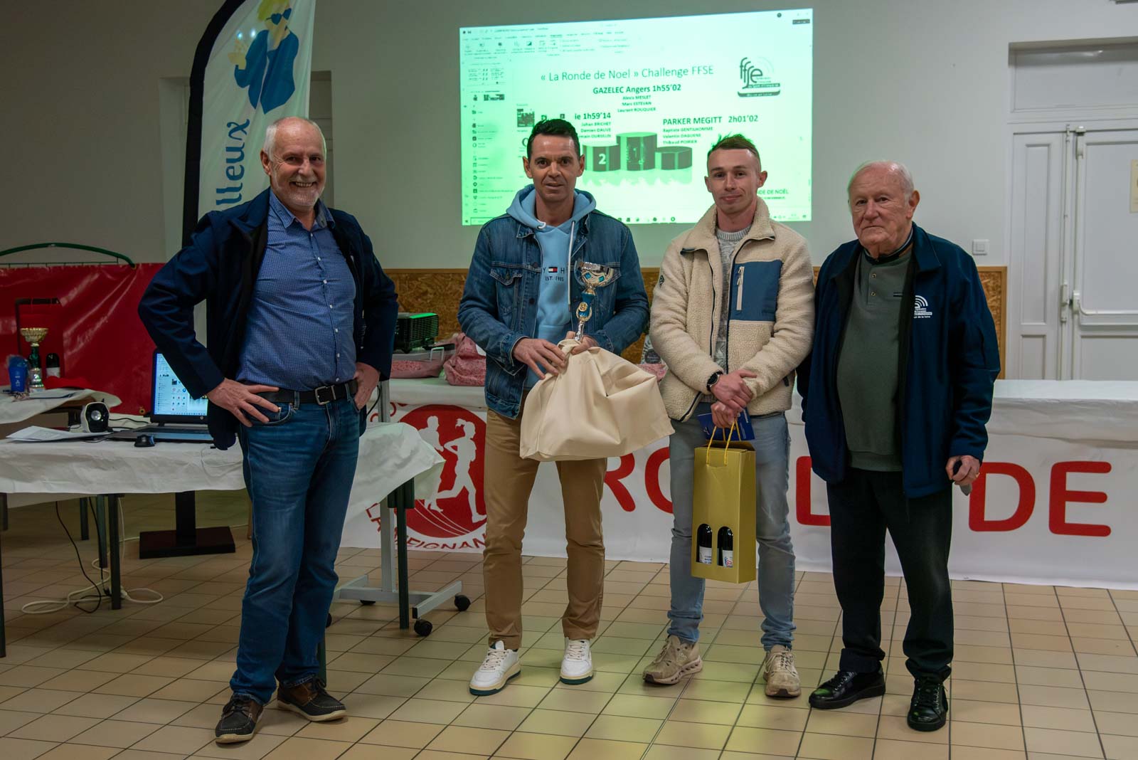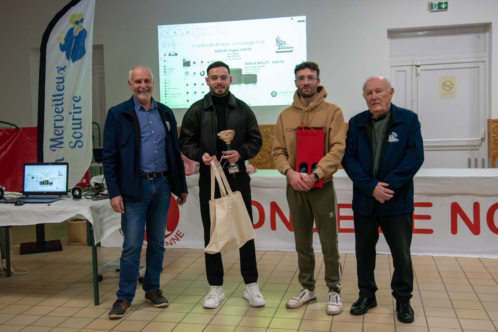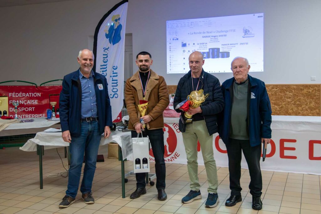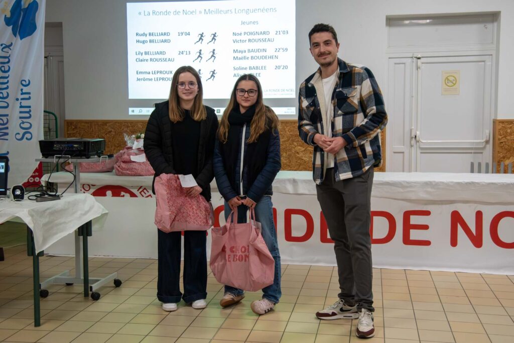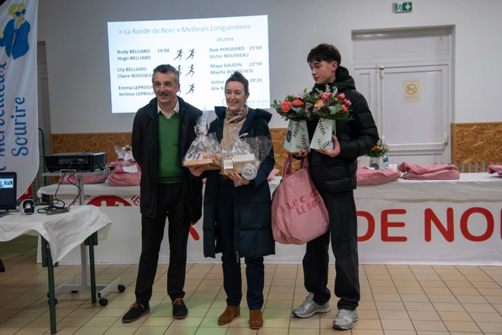 Soirée partenaires Ronde 2025Présence des partenaires de la ronde avec remise de lots aux meilleurs coureurs longuenéens 10 km masculin 1er duo féminin et et 1er duo masculin 1er duo jeune masculin 1er duo jeune féminin Meilleurs déguisements Challenge FFSE - 1er Gazelec Angers Challenge FFSE - 2ème Ecole du Génie Challenge FFSE - 3ème Parker Megitt Remerciement au motard ouvreur de la course Remise du chèque de la FFSE à la Vice-Présicdente de l'association CAP La Meignanne Remise du chèque à l'association "Un Merveilleux Sourire"